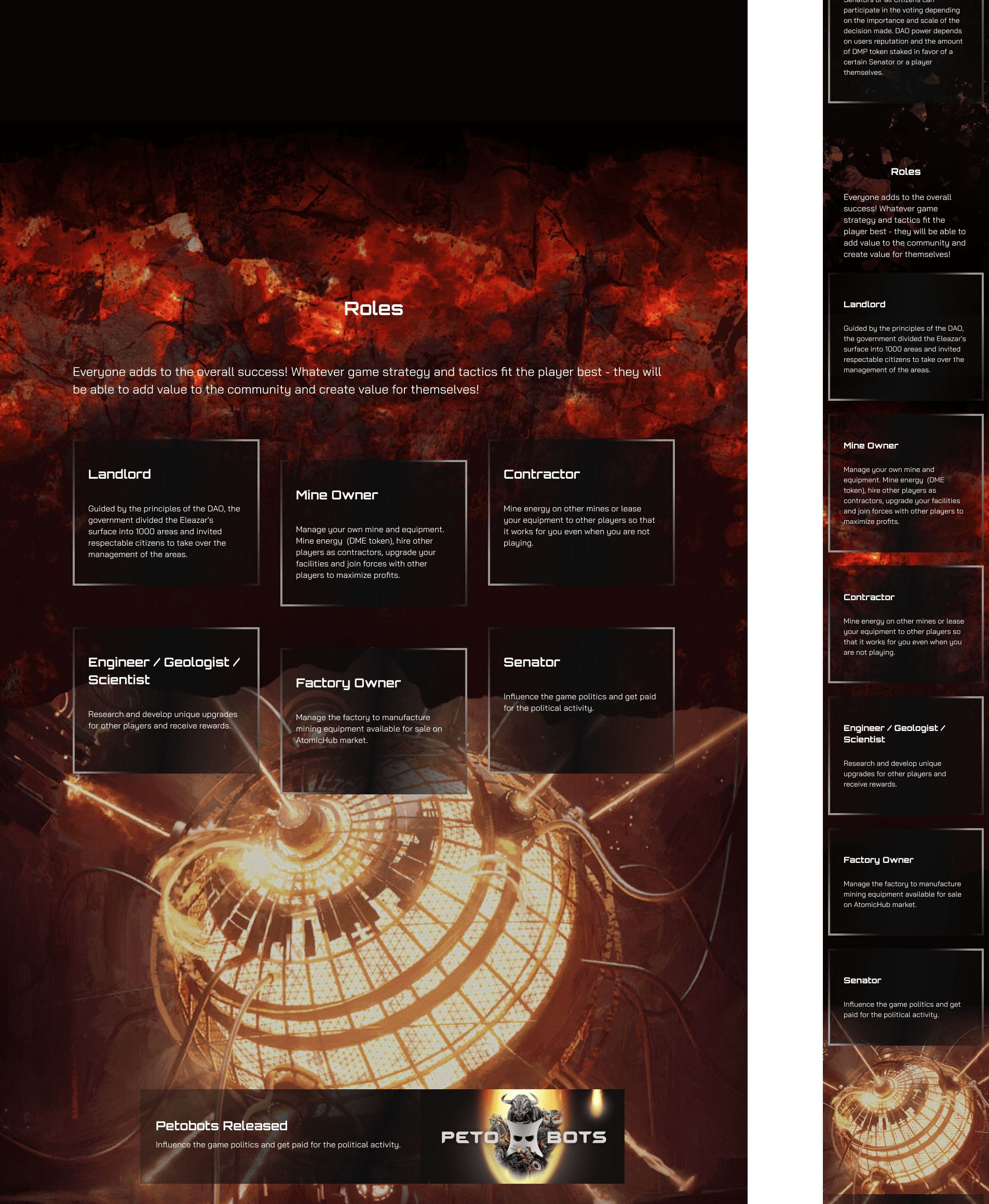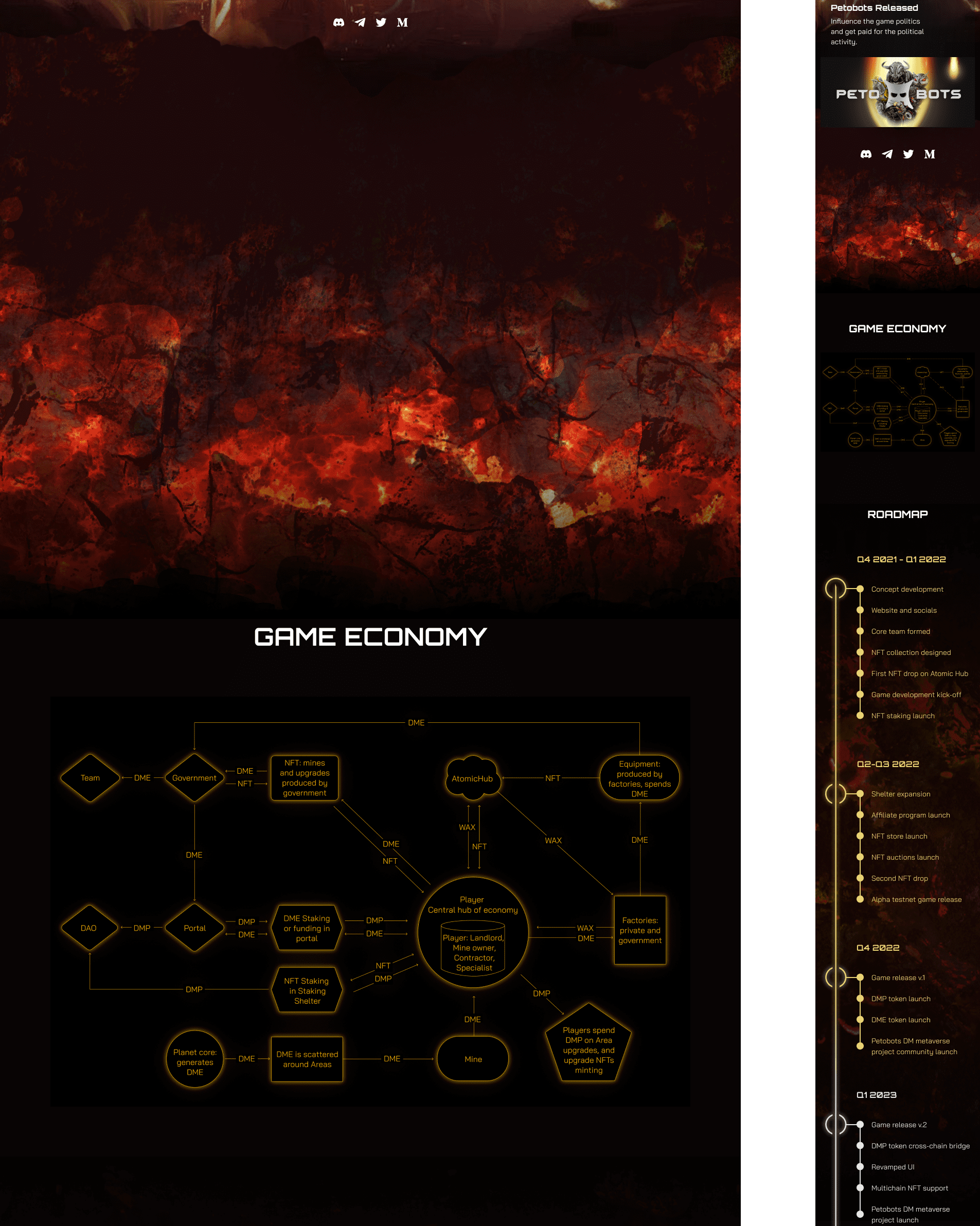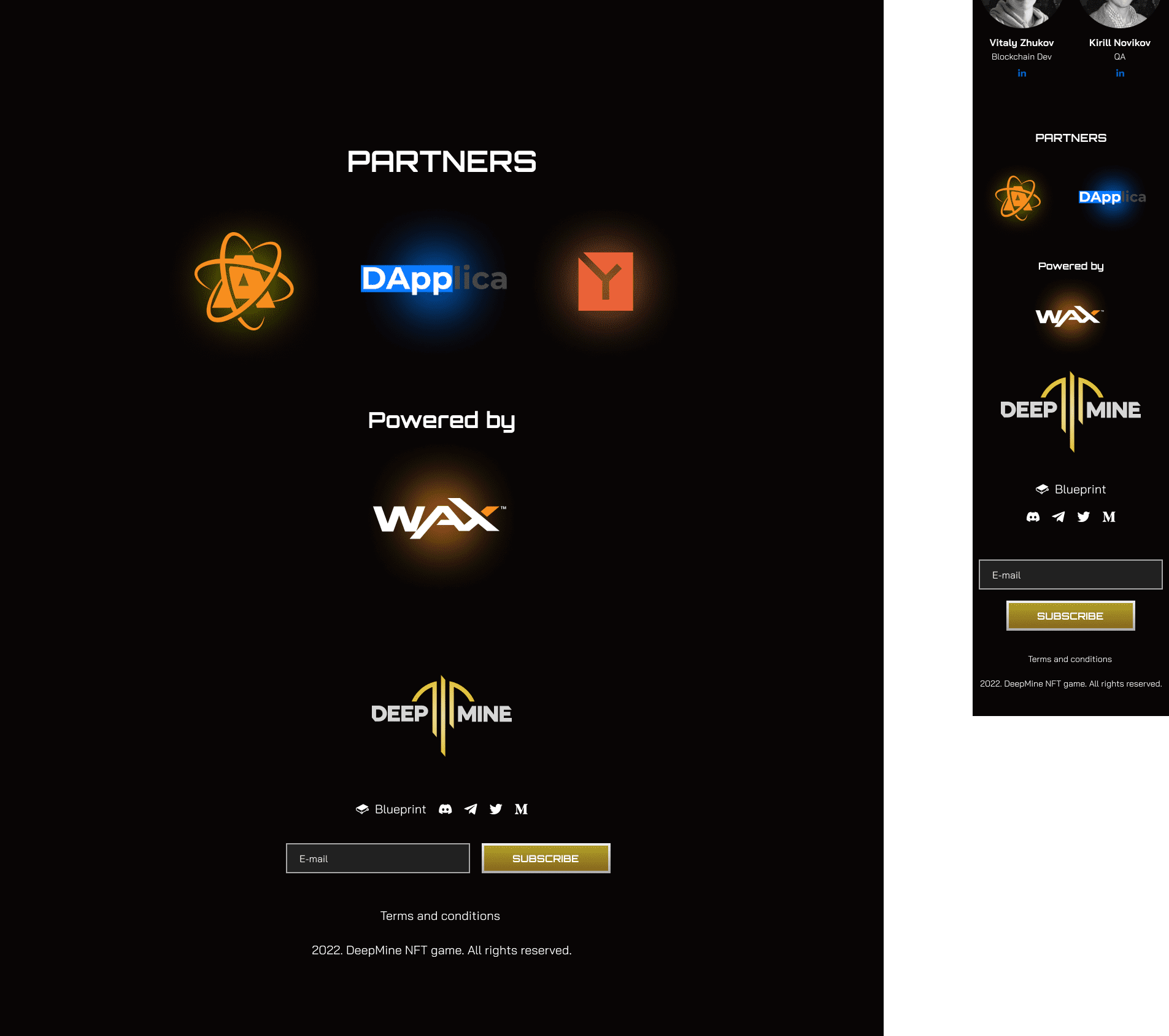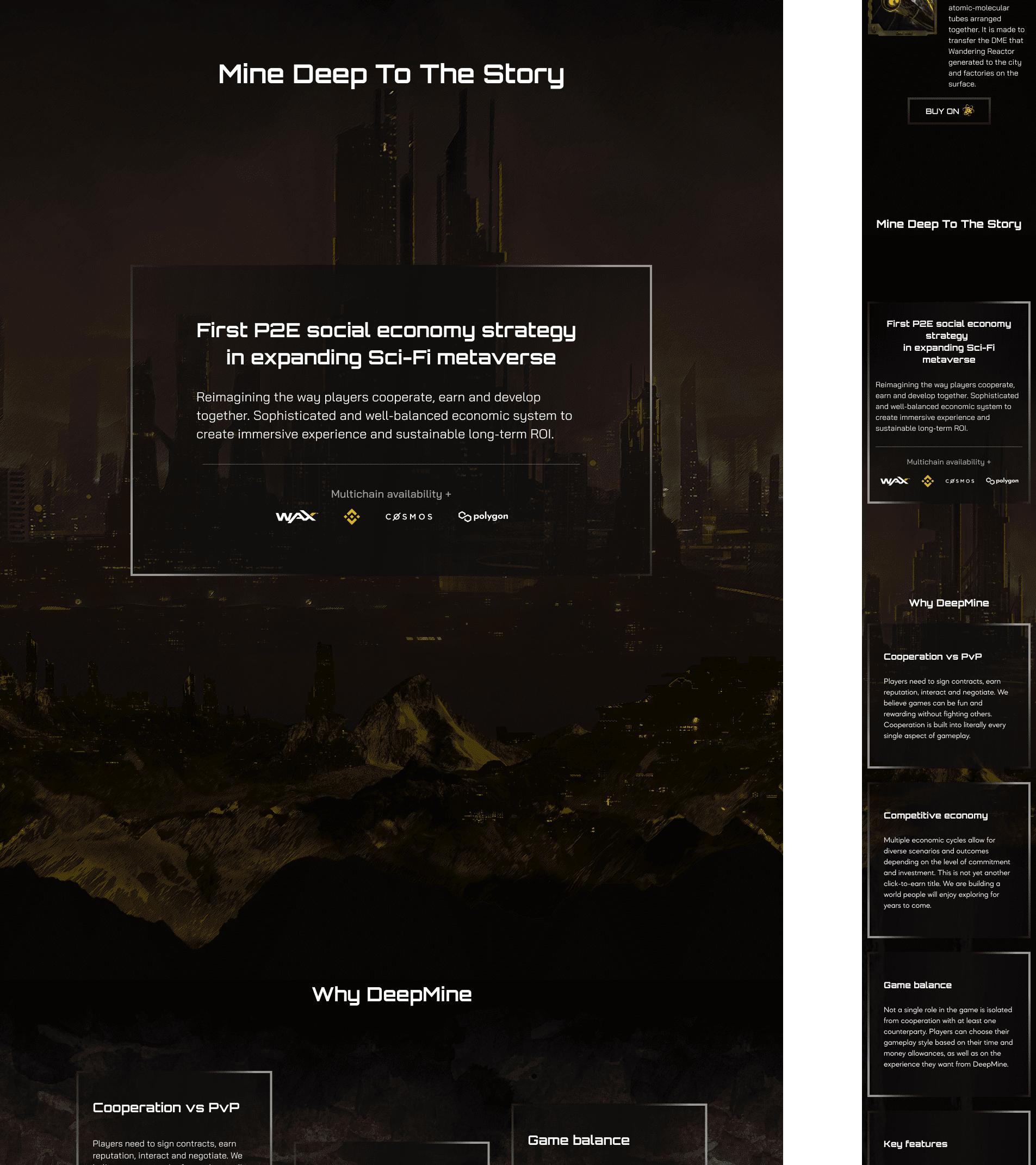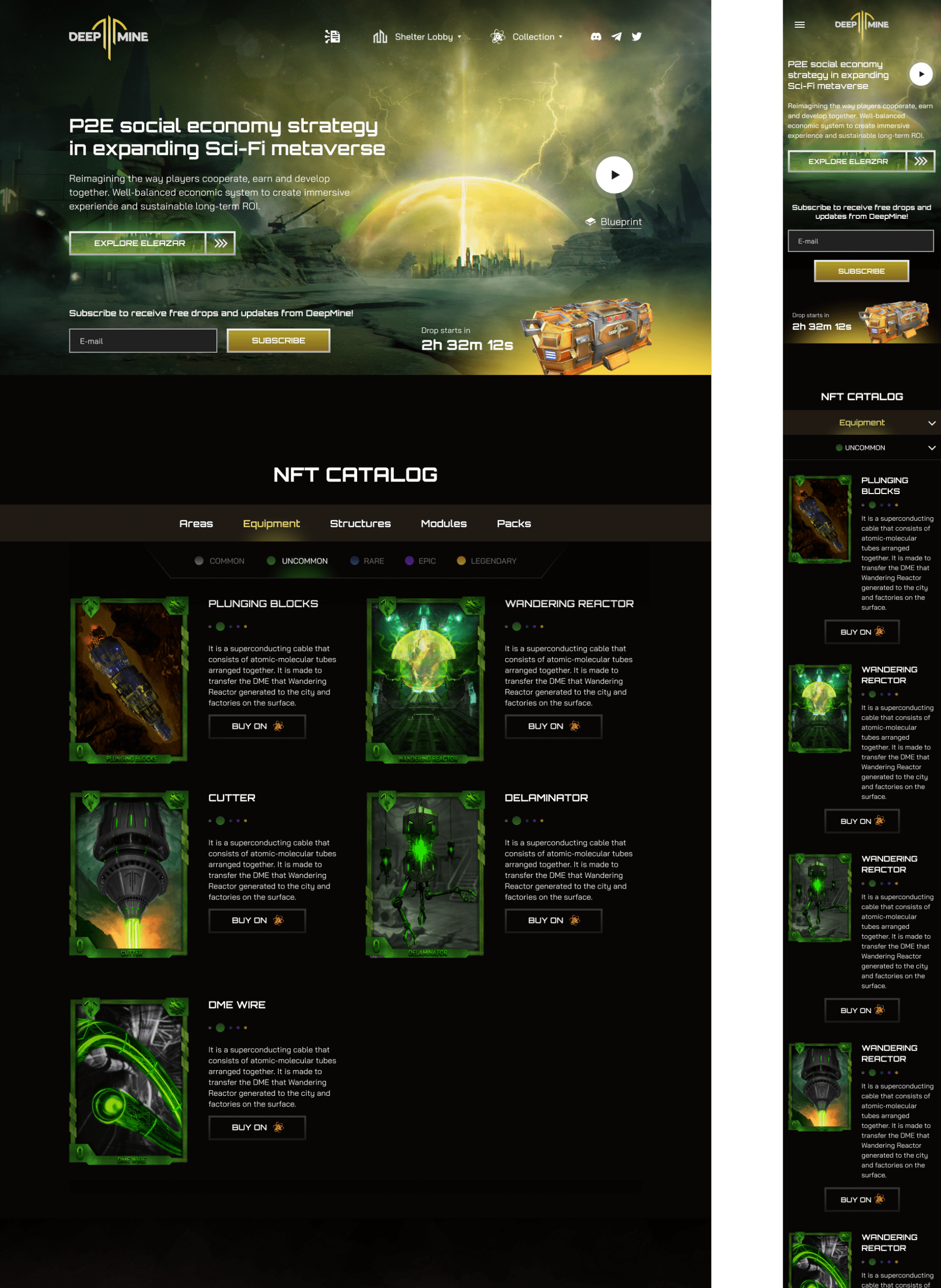 A high‑conversion web interface built to drive user acquisition and engagement for a complex blockchain game. The design strategically balances immersive world‑building with clear value propositions, guiding visitors from initial interest to concrete actions: exploring the game, subscribing for updates, and anticipating NFT drops—all within a cohesive sci‑fi aesthetic that supports the product’s strategic positioning.