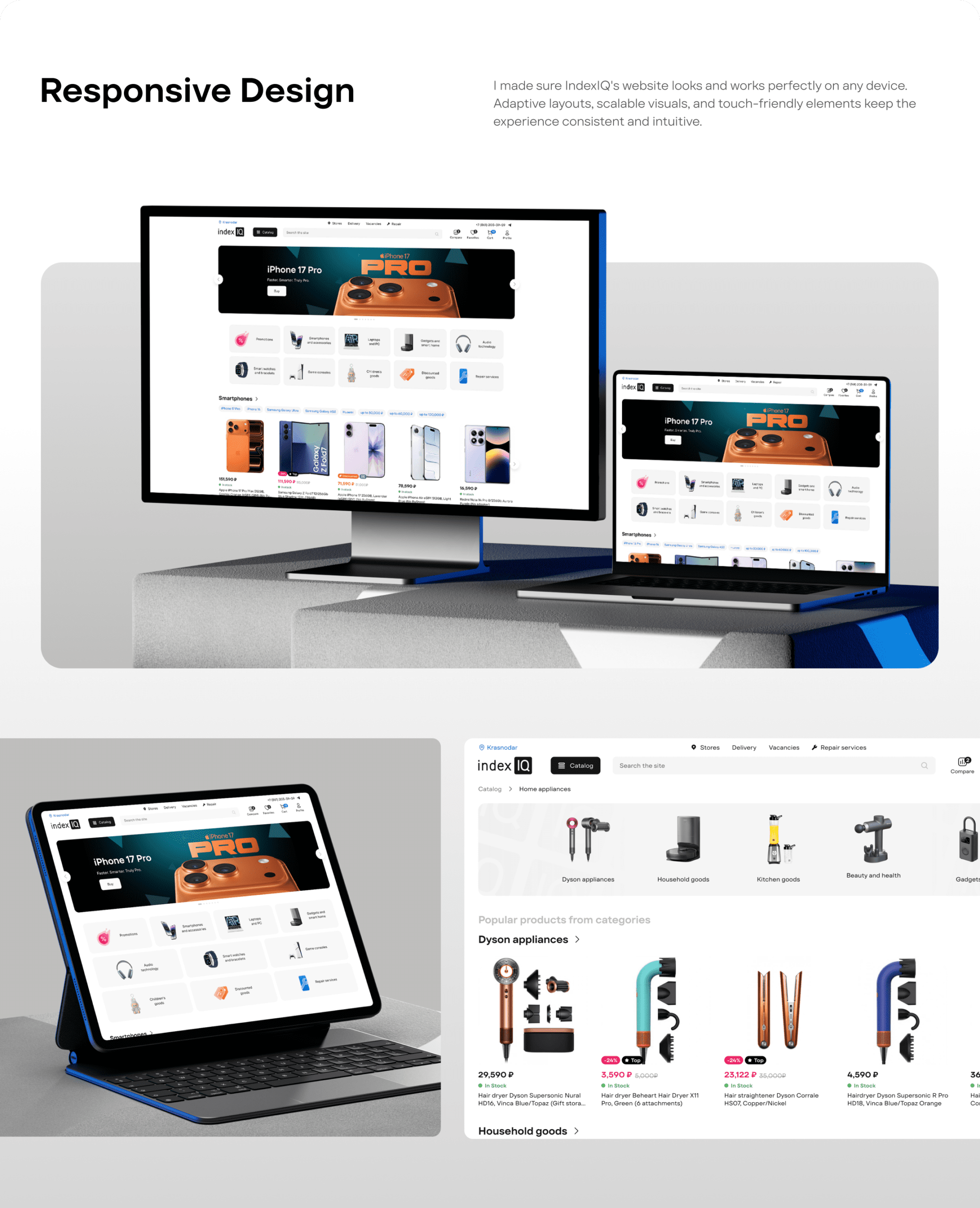 My challenge was to transform a complex, multi-category electronics store into a seamless and enjoyable shopping flow. From navigation and search to product hierarchy and visual identity, every part of the experience required a fresh start.